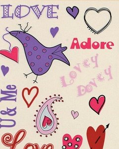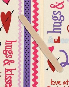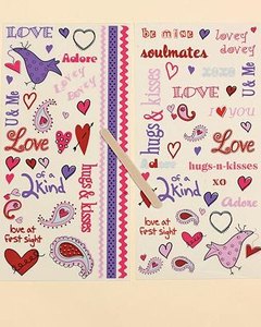 バレンタインにちなんだハートや LOVE の文字、ボーダーなどのラブオンシールが 2シート入っています。全部で 65個のラブオンシールが付いています。付属の木製スティックで擦るだけで簡単に絵が転写します。