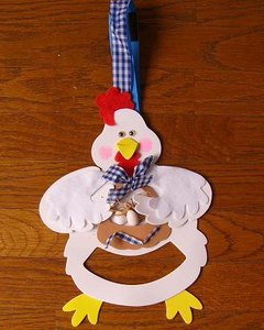 細いリボンをバスケットのピースに貼付け。続けて短く折ったワラの束を貼り、その上に木製の卵ピース 2個を貼付けます。完成したバスケットをお腹の中心に貼付けます。