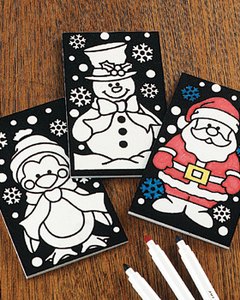 クリスマスにちなんだ絵柄が白抜きになったメモ帳です。 25ページ。表紙は黒のビロードのような加工になっていて、表面が盛り上がっています。白抜きされた部分をご家庭のフエルト ペンや色鉛筆で塗っていきます。 ※ 絵柄はお任せください。