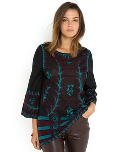 [色・デザイン] お色は黒地に青と濃紫の刺繍。薄いコットン地にエスニック風の刺繍柄が映えるトップです。頭からすぽっとかぶるタイプ。八分袖。