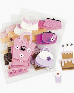 ラメやビーズ、ラインストーンがお洒落なスポンジフォームのシールです。バッグとケーキ柄の2シートセット。