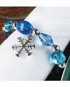 雪の結晶のチャームと 2色の青いプラスチックビーズ、シルバー調のビーズで作るナプキンリングのキットです。