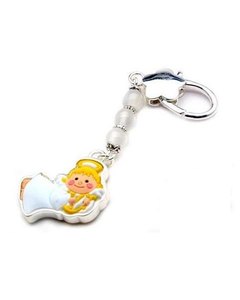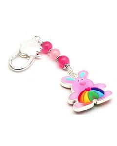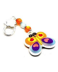 [デザイン] お花型の留具にプラスチック製ビーズのチェーンに 4cm大のチャームが付いています。チャームの表面はゴム製で立体的になっています。 レッスンバッグのアクセサリーにどうぞ。