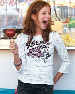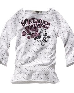 [色・デザイン] 白地に赤のドット柄。フロントに BOHEMIAN RHAPSODYの文字と花柄プリントが入っています。スクエア ボートネック、七分袖のニット調の長袖 Tシャツです。