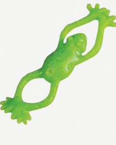 前足を指にひっかけ、後足をぎゅっと引っ張って瞬時に離すとカエルが飛ぶしくみになっています。簡単で素朴なおもちゃです。ビニール製。