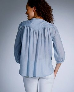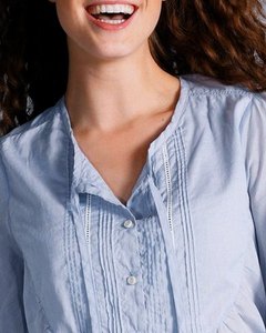 [色・デザイン] Levi’s®ブランドの中心的存在 Red Tab Girls のコットンデニムトップ。胸元のピンタック、フロントと袖下から脇のレース扱いがフェミニンなブラウストップです。七分袖、フロントボタン開閉。
