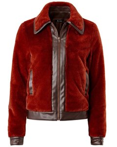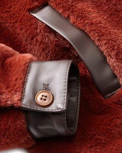お色は濃いルイユ(rouille)色。ルイユ色とはフランスの伝統色で黄みがかったあざやかな赤色になります。ボディはやや光沢のあるふわふわマイクロファー。襟縁、裾口、裾、ファスナー部に合皮があてられていてアクセントになっています。