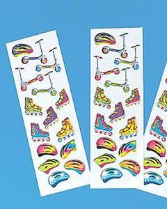 ローラースケート、スクーター、ヘルメットのシールです。 1シートに 15枚のシール付いています。原色が映える紙素材のシールです。