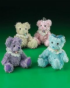 身長 16cm大のかわいいクマのぬいぐるみになります。首にレースとリボンフラワー、頭にオーガンジー調のリボンを付けています。