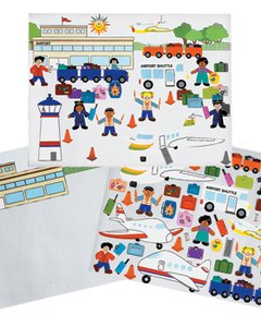 横 28cm x 縦 21.5cm大の背景用の台紙に45枚のシールシートが付いています。飛行機、パイロット、乗客、スーツケースなどのシールを自由に貼り付けて、オリジナルの空港を完成させてください。台紙とシールシートのセットになります。