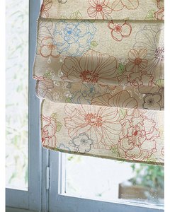 [色・デザイン] ベイジュに花のライン絵。程よい透け感で、優しく光を遮ります。背面2箇所、縦にナイロンコードが通っています。この2本のコードをカーテン右サイドで上下に上げ下げできますので、ご自宅の窓のサイズに合わせて長さをご調節いただけます。取り付け金具付き。
