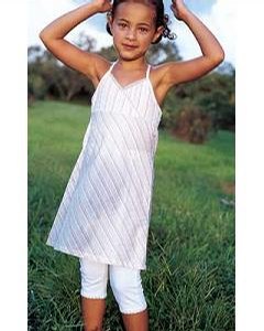 [色・デザイン] ストライプ柄。夏らしいピナフォア・ドレスです。フロントの重なっている部分には濃いピンクのマクラメレース仕上げ。サイドファスナー開閉、ショルダーストラップは背中でクロスしてボタンで留めます。