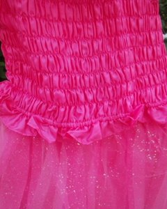 [色・デザイン] お色は濃いピンク。ツーピースにヘッドバンドが付いたプリンセスのドレスです。トップはキャミソール型でキャップスリーブ。身頃がシャーリング加工されているのでお子さまの成長に合わせて来ていただけます。スカートはサテン地の上に 2色のネット地がレイヤーで重なっています。ウエスト総ゴム、一番上のネットはラメ付き。