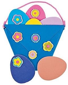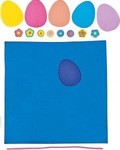 折り紙の要領で青いシートをバスケットの形に折り上げ、キットの飾りピースを卵型フォームピースに貼り付けて仕上げます。ご家庭のクラフト(木工)用ボンドをお使いください。