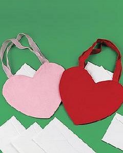 ピンクと赤のキャンバス地でできたハート型バッグとハート柄のメタリック熱転写シート 2枚のセットです。その他にもご家庭にあるラメやラインストーン、ボタンなどで飾り付けてオリジナルバッグを作成してみてください。