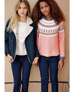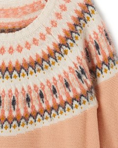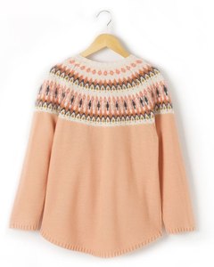 お色はサーモンピンク。白、緑、オレンジのフェアアイル柄がお洒落です。ラウンドネック。