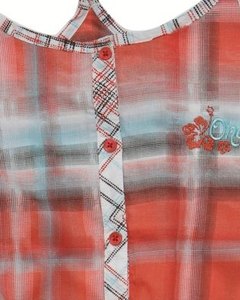 [色・デザイン] オレンジ、ブルー、ブラウン、白のチェック柄。フロントボタン開閉。ストラップはバック中央からフロントに。長さ調整可。 ドッツで描かれたチェック柄のストラップとウエストコードがお洒落です。ビーチで、リゾートでどうぞ。