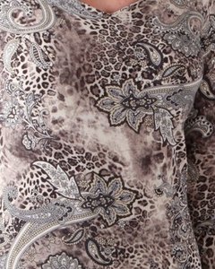 [色・デザイン] お色はブラウン系。ペイズリーとアニマル柄がお洒落な長袖 Tシャツ。七分袖、フェミニンなネックライン。