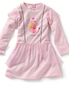 オーロラ姫のドレスがパジャマになりました。淡いピンク地。 肩からウエストにシルバーのスパンコールが並び、ふわっとネットが付いています。 胸元にはオーロラ姫の絵と Princess の文字プリント。 長袖。ワンピースタイプです。ズボンは付いていません。