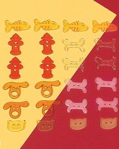 イヌとネコのペットをテーマにした透明と半透明の 2種類のプラスチック製ボタンです。犬、猫、骨、消火栓、魚の骨のセット (12個入り)になります。スクラプブッキングのアクセサリーはもちろんレッスンバッグや小物のワンポイントにもどうぞ。