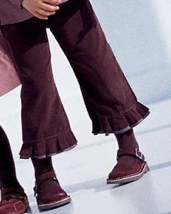 [色・デザイン] お色はプラム。コーデュロイ地の七分丈 ボトムズ。サイドファスナー開閉、ウエストバックにゴム入り。フロントに 2つ、バックに 1つポケット付き。 2重のフリル仕上げの裾がとてもかわいいデザインです。秋 - 冬 - 春と 3シーズン着ていただけます。