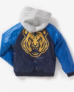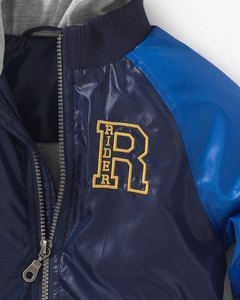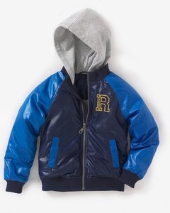 お色は身頃が濃紺、袖が明るい青、フードはグレーになります。ポケット2個付き、ファスナー開閉。