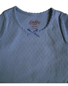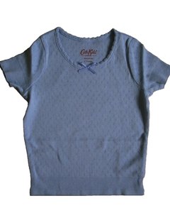 [デザイン] お色は水色。針抜きコットンの肌触りの良さと袖と裾のリブ編みがアクセントの Tシャツです。