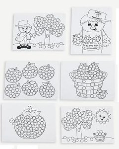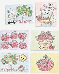 ご家庭のクレヨンや丸いシールで色塗りが楽しめるワークです。リンゴの部分にご家庭の赤いドッツシールをご褒美日シールとして貼っても楽しいです。