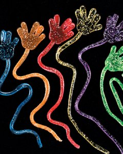 なんとも柔らかい、ゼリーのような素材の雑貨おもちゃです。 15cmの紐の先に 3cm大の手が付いていて、紐と手を引っ張るとビヨーンと伸びます。ハロウィン、クリスマス、 イースターなどの季節のイベントのクイズの景品にどうぞ。