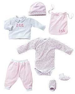 [セット内容] 長袖ボディ (小花柄) / ズボン (ボーダー柄) / 襟付き長袖シャツ (背中スナップ開閉) / フットカバー(小花柄) / 帽子 (ボーダー柄)