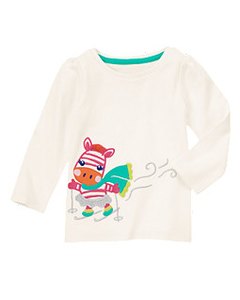 [商品説明] お色はオフホワイト。シマウマの女の子がスキーをしているアップリケがかわいい長袖Tシャツ。スカートや風がシルバーの糸で刺繍されていて、きらきらしています。冬の季節にぴったりのデザインです。