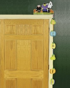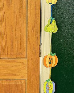 ご家庭のクレヨン、マーカー、色鉛筆などでパンプキン型のピースを色塗りして、キットのリボンでつなげて作るドア飾り。ドアの上面に取り付けます。