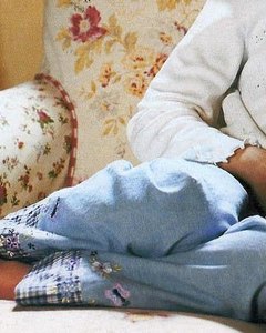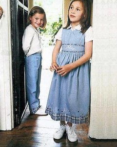 [色・デザイン] ダンガリーのライトブルーに裾のチェック地がワンポイント。チェック地切り替え部分には花や蝶の刺繍が入っています。フロントポケット 2個。ウエストバック総ゴム。