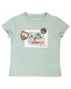 [デザイン] ヴィンテージ ウォッシュ調の柔らかコットンにサーフボートで遊ぶ男の子のプリント布とワッペンが夏らしいデザインです。