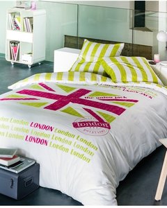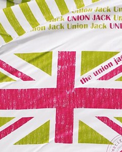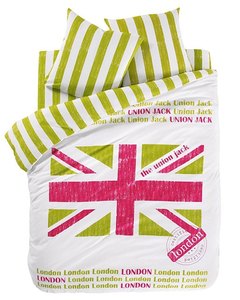 [色・デザイン] 白地にライムグリーンと赤紫のユニオンジャックプリント柄。かすれタッチがお洒落です。カバー、ピローケース共に上部開口で、ファスナーやスナップボタンが無いタイプです。