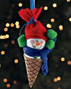 耳あてをつけたかわいい雪だるまが入ったアイスクリームコーンのオーナメントです。