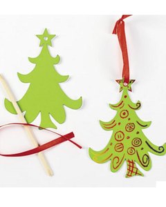 スクラッチアートで作るクリスマスツリー型オーナメントです。オーナメントの表面をキットのスティックで擦ると緑の膜の下から虹色の背景が線に沿って見えてきます。 3枚につき 1本のスティックが付いています。