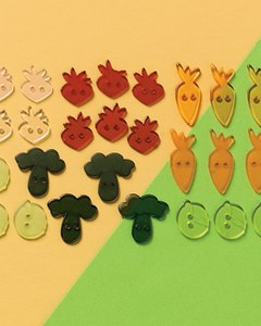 透明と半透明の 2種類のプラスチック製ボタンです。にんじん、ラディッシュ、ブロッコリ、レタスのセット (12個入り)になります。スクラプブッキングのアクセサリーはもちろんレッスンバッグや小物のワンポイントにもどうぞ。