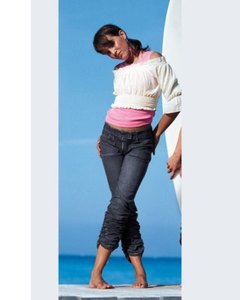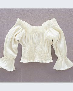 [色・デザイン] お色はオフホワイト。5分袖、ショート丈のトップです。身頃の上下に入ったスモッキング仕上げがアクセント。重ね着にどうぞ。