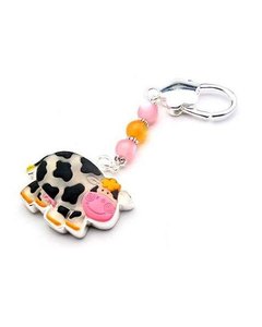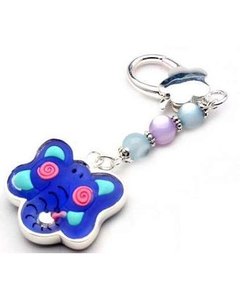 [デザイン] お花型の留具にプラスチック製ビーズのチェーンに 4cm大のチャームが付いています。チャームの表面はゴム製で立体的になっています。