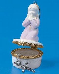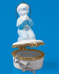 8.8cm 大の陶器製ヒンジボックスで、男の子と女の子がひざまづいてお祈りをしているデザインになります。クリスマスやイースターの飾り付けなどにどうぞ。