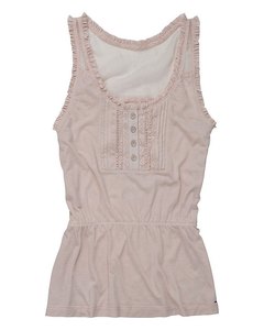 [色・デザイン] Brexton knit Tanktops お色は淡いオールドローズ。フロントボタン 4個開閉。襟のフリルとフロントのレース使いがフェミニンなデザイン。肩とバックはクレープ地のシースルー。