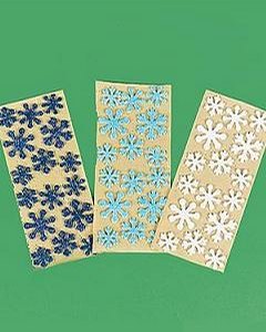 0.5mm厚のスポンジフォームの表面にラメが付いた雪の結晶柄のシールです。雪の結晶の大きさは 1.7 - 2.5cm大で、 1シートに 15枚のシールが付いています。