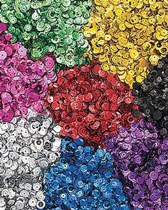 金、銀、赤、緑、黒、青、紫、赤紫の 8色が入ったスパンコールのセットです。各色が 9gずつ、ミックスで袋に入っています。