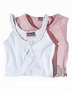 [デザイン] キャミソールとタンクトップの 2枚セット。キャミソールは切りっぱなしの共布を使ったフリルがかわいいです。タンクトップはフロントにドットラインで花模様のプリントが入っています。