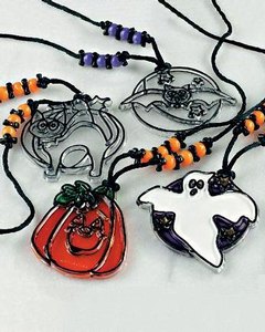 5 - 5.5cm大のプラスチック製サンキャッチャーにビーズで飾り付けるネックレスのクラフトです。サンキャッチャーはウインドデコレーションと呼ばれるステンドグラスタイプです。絵柄は HALLOWEEN柄。ペイントは含まれておりません。サンキャッチャー用ペイントや市販の油性マーカー、絵の具(樹脂・アクリル系)などで色付けするとステンドグラスのように光が通過して綺麗です。 ※ 絵柄はお任せください。