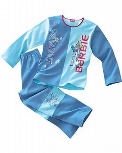 [色・デザイン] 2色のブルーの切替がお洒落な長袖パジャマです。 BARBIE の文字と雪の結晶、スノーボードを持ったバービーのプリント入り。