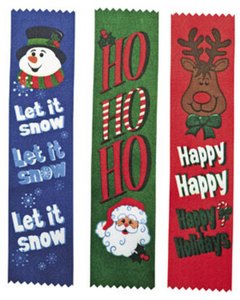 赤、青、緑のサテンリボンにクリスマスのキャラクターとメッセージが入った栞です。