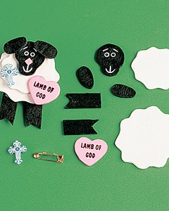 木片のピースを貼り合わせてかわいい子羊のバッジを作るクラフトです。ピンクのハートには LAMB OF GOD のメッセージ入り。