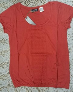 [色・デザイン] お色は赤。フロント縦に入ったミシン刺繍のクレープ地の切り替えがアクセント。袖口はゴムギャザー。